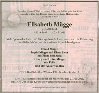 Elisabeth Alteheld * 15. September 1936 † 23. Juli 2011