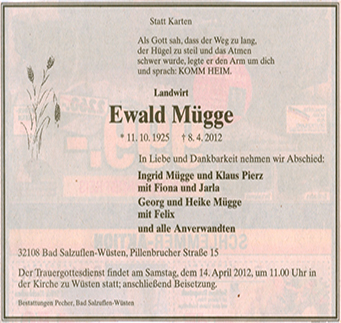 Ewald Mügge * 11. Oktober 1925 † 8. April 2012