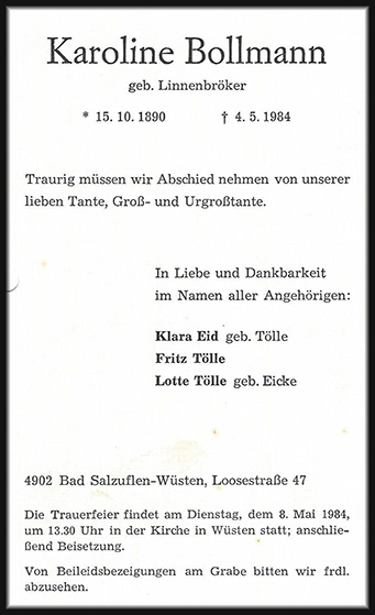 Ehefrau Karoline Linnenbröker, die Großmutter, aus