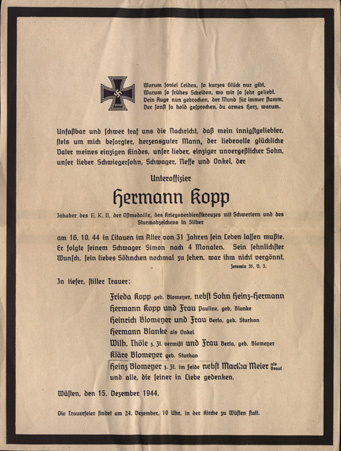 Am 16.Oktober 1944 fiel Hermann Kopp in