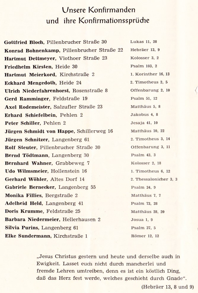 Mitschüler Rainer Missing, die Namen der Konfirmanden vom 5.